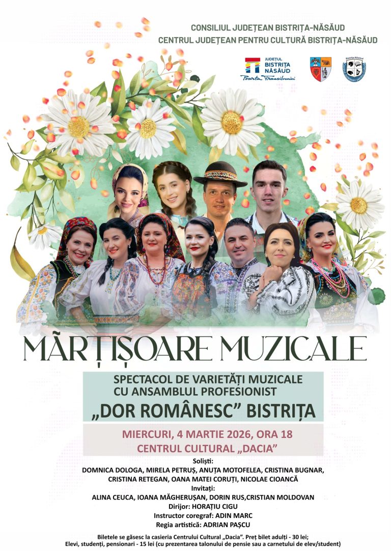 CulturalEveniment Mărțișoare muzicale la Centrul Cultural „Dacia” din Bistrița Maria MihăilăFebruary 24, 20260 Centrul Județean pentru Cultură Bistrița-Năsăud, în colaborare cu Consiliul Județean Bistrița-Năsăud, vă invită miercuri, 4 martie 2026, de la ora…