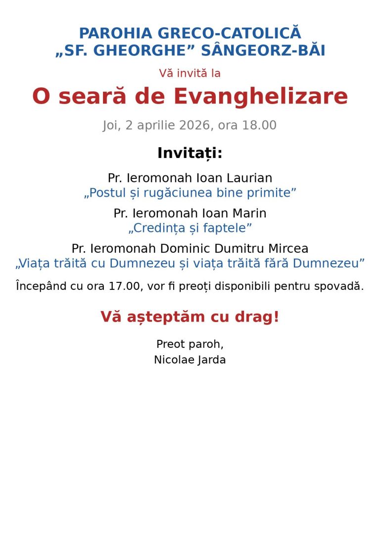 Eveniment Seară de evanghelizare la Sângeorz-Băi, sub egida Parohiei Greco-Catolice „Sf. Gheorghe Maria MihăilăMarch 30, 2026March 30, 20260 Parohia Greco-Catolică Sf. Gheorghe din orașul Sângeorz-Băi, vă invită la o seară de evanghelizare, care va avea loc joi, 2…