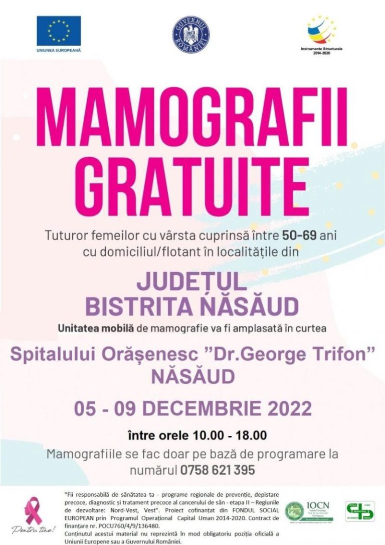 Știri Mamografii Gratuite la Spitalul Orășenesc din Năsăud Maria MihăilăNovember 16, 2022November 16, 20220 Toate femeile cu vârsta cuprinsă între 50 şi 69 ani, cu domiciliul în județul Bistrița-Năsăud, au acces gratuit la serviciile…
