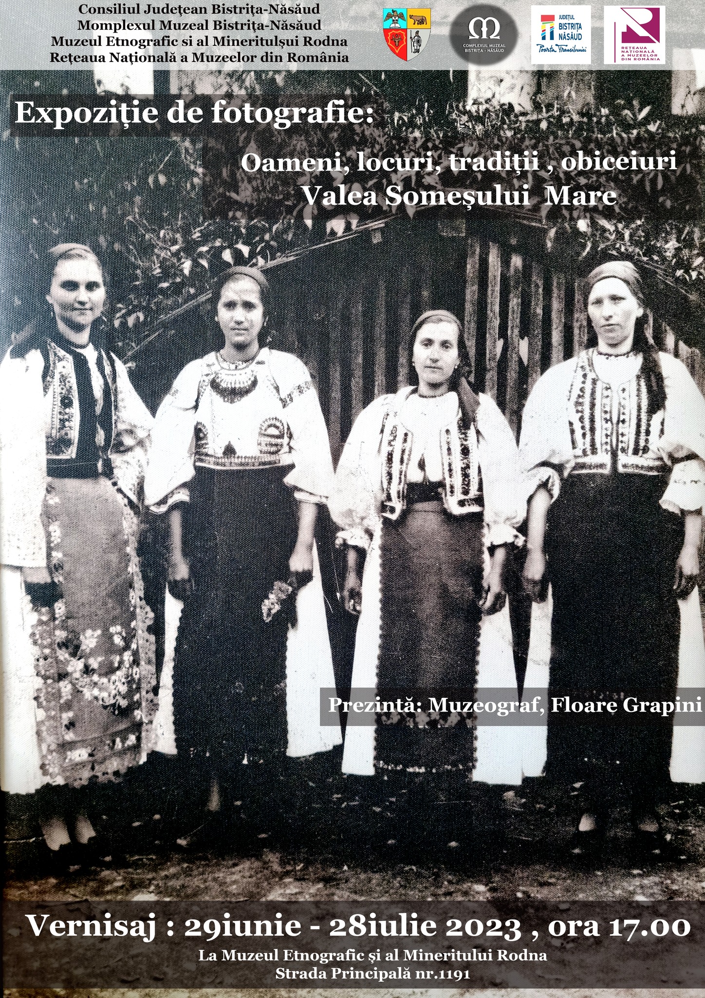 Sub egida Consiliului Judeţean Bistriţa-Năsăud, a Complexului Muzeal Bistriţa – Năsăud, Muzeul Etnografic şi al Mineritului Rodna, vă invită joi, 29 iunie 2023 ora 17.00 la vernisajul expoziţiei de fotografie „Oameni, locuri, tradiţii, obiceiuri.”
