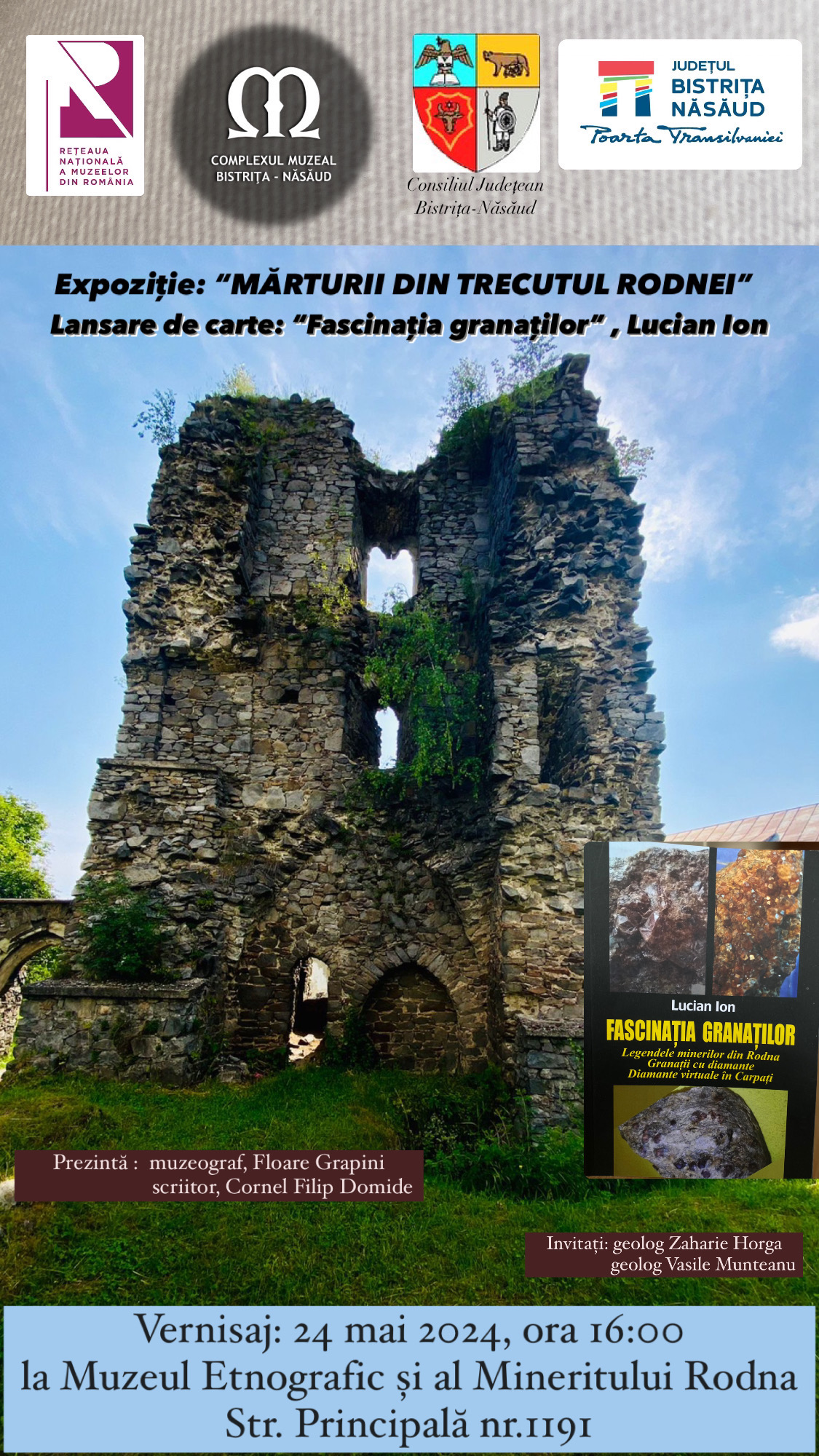 Vernisajul va fi întregit de lansarea volumului intitulat ,,Fascinția Granaților” ce îngemănează mai multe legende culese de la minerii din Rodna, care vorbesc despre identificarea în Țara Năsăudului a granaților roșii – însoțitorii permanenți ai diamnatelor virtuale, localizate atât în șisturile cristaline și scarnele din masivul Rodnei cât și din alte zone din Carpați. Volumul poartă semnătura lui Lucian Ion. De profesie inginer geolog, domnia sa este autorul mai multor lucrări de specialitate în care se regăsesc o parte din însemnările personale dar și detalii ale cercetărilor și descoperirilor realizate alături de echipa sa de prospecțiuni, de la I.P.E.G. Cluj. Amintim aici ”Căutătorii de aur din Carpați” (2007), ”Aurul Rodnei” (2011), ”Mistere geologice din regiunea Rodna”(2021). Sunt cărți care considerăm că vor constitui un punct de referință pentru generațiile viitoare.