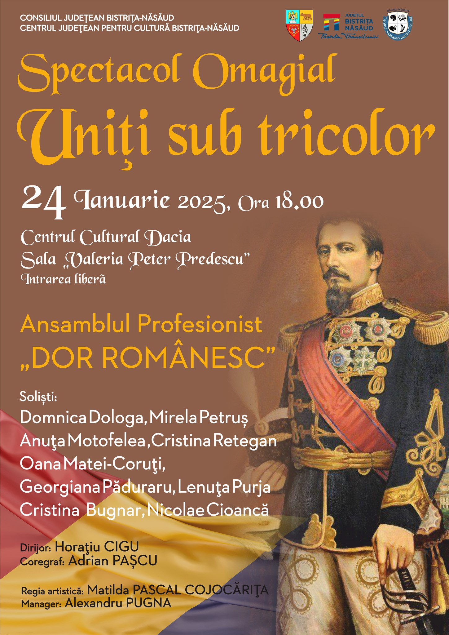 Pe 24 ianuarie , cu ocazia celebrării Unirii Principatelor Române, Consiliul Județean Bistrița-Năsăud și Centrul Județean pentru Cultură Bistrița-Năsăud organizează un spectacol omagial dedicat unității și tradițiilor românești . Evenimentul va avea loc începând cu ora 18:00, la Centrul Cultural Dacia, în sala „Valeria Peter Predescu”.