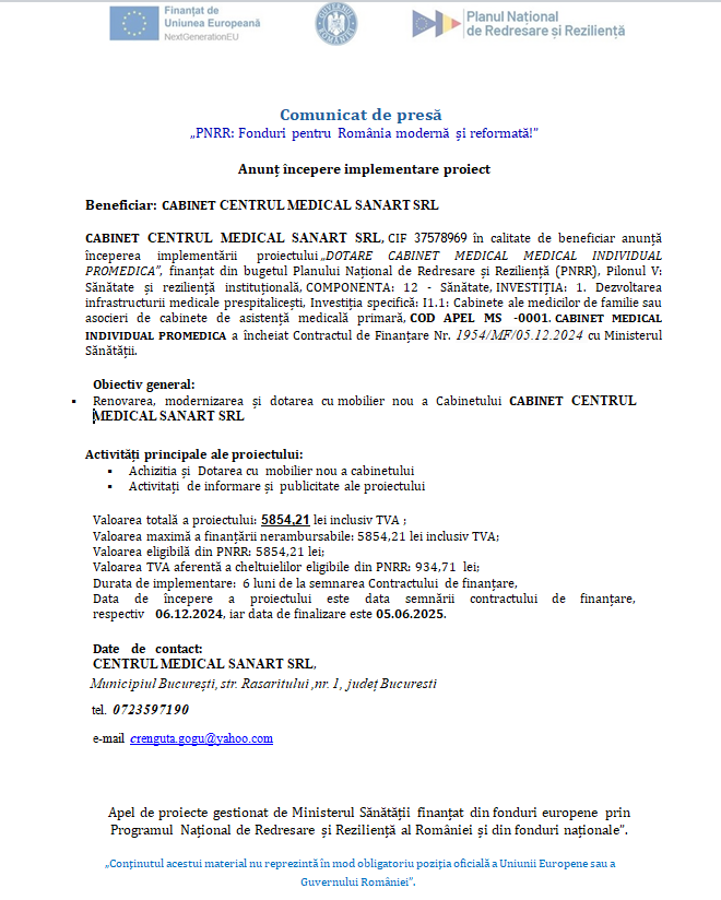 CABINETUL MEDICAL CM SANART SRL, anunță începerea implementării proiectului „Dotare Cabinet Medical Individual Promedica”, finanțat prin Planul Național de Redresare…